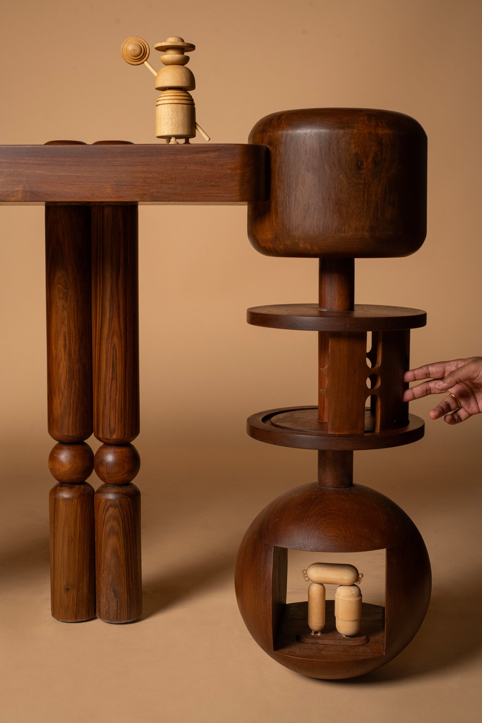 Dash & Dot Console is a refined entrance piece inspired by the playful rhythm of dashes and dots. Crafted from teak wood, it unites spheres and capsules in harmonious composition. An interactive rotating jaali adds versatility, while thoughtful storage blends functionality with sculptural elegance, warmth, and modern charm.